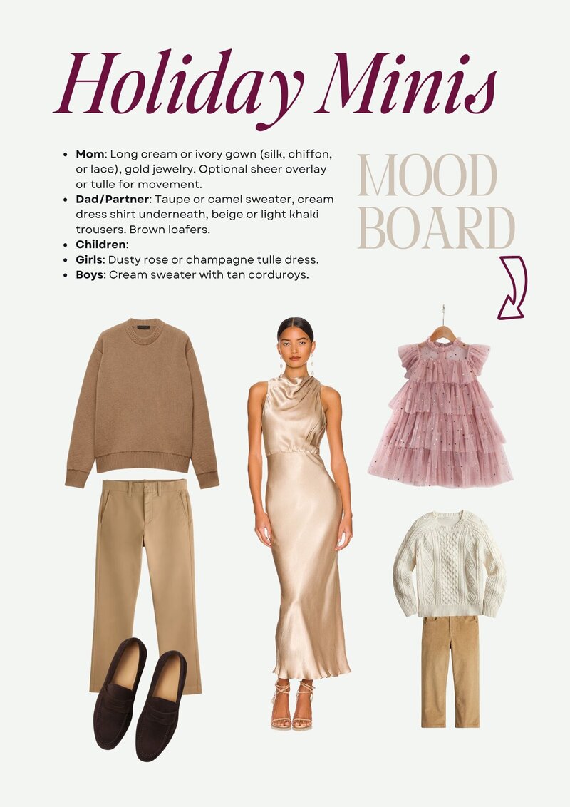 Clothing. We suggest seasonal clothing but you may wear whatever you wish. Given that sessions are only 25 minutes, there won't be much time for outfit changes, but you are welcome to bring a set of matching PJs for the children and family for our bedroom scene.